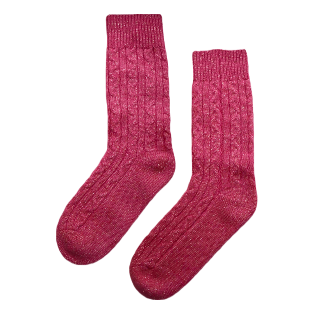 Luxuriously soft and unapologetically playful, The G.O.A.T. - Iconic Pink is made in Inner Mongolia from 100% cashmere, with glimmering lurex woven through its cable-knit pattern. Designed to keep you warm while making a statement, this pair turns comfort into stylish.