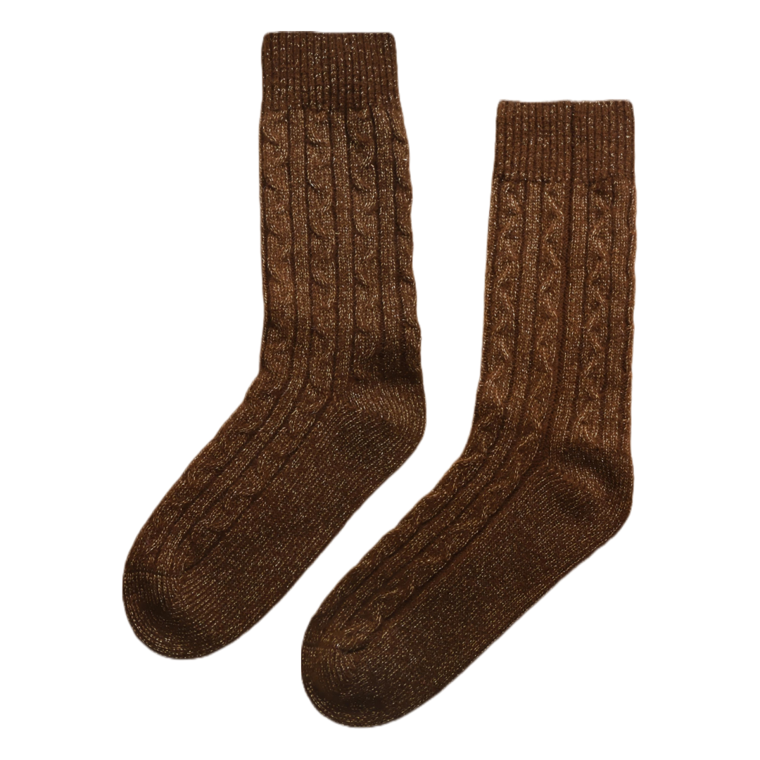 Made in Inner Mongolia from the finest 100% cashmere and finished with a delicate shimmer of lurex, this sock is where warmth meets quiet luxury. The Mocha Muse colourway: a deep, milky, coffee tonebrings effortless sophistication to any look.